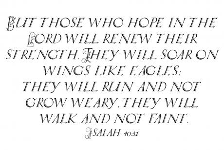 "But those who hope in the Lord will renew their strength. They will soar on wings like eagles; they will run and not grow weary, they will walk and not faint." -Isaiah 40:31