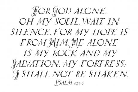 "For God alone, Oh my soul, wait in silence, for my hope is from Him. He alone is my rock and my Salvation, my fortress; I shall not be shaken." -Psalm 62:5-6